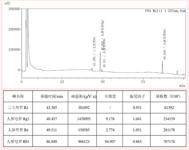 使用恒谱生Hsol?三七皂苷专用柱,5μm,4.6mm×250mm色谱柱,在该条件下,进行测试,满足理论塔板数按人参皂苷Rg1峰计算应不低于6000,人参皂苷Rg1与人参皂苷Re的分离度应大于1.8的要求。