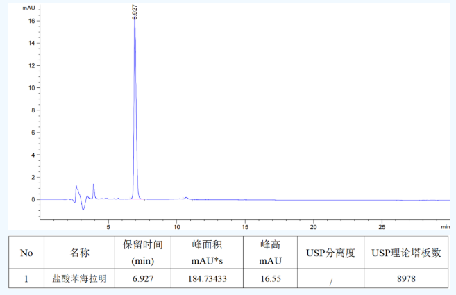 使用恒谱生USHD CN色谱柱, 5μm, 4.6×250mm, USHD C18-AQ色谱柱, 5μm, 4.6×250mm, 在两种条件下测试,理论塔板数按盐酸苯海拉明峰计,均满足药典要求。